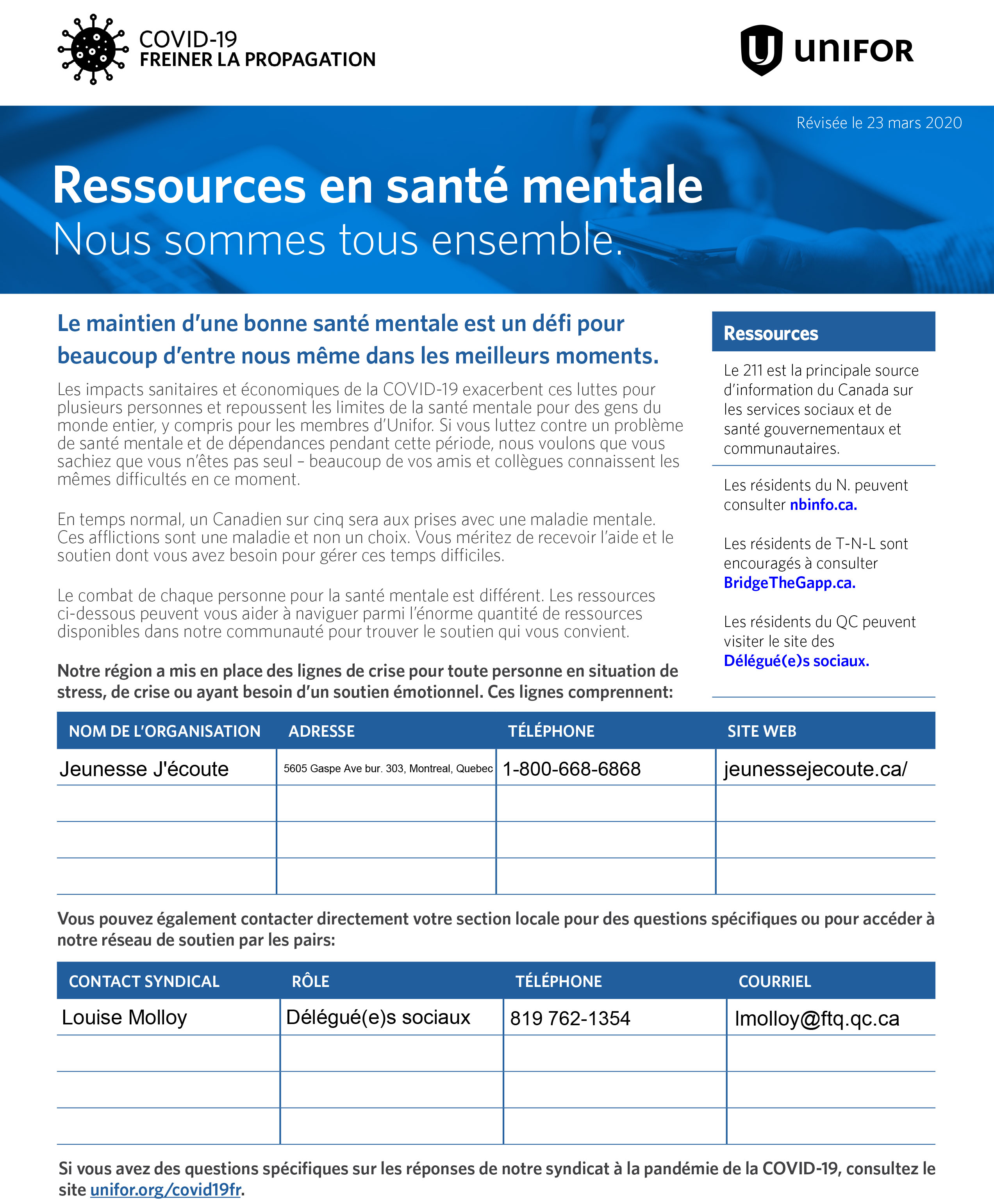 Les impacts sanitaires et économiques de la COVID-19 exacerbent ces luttes pour plusieurs personnes et repoussent les limites de la santé mentale pour des gens du monde entier, y compris pour les membres d’Unifor. Si vous luttez contre un problème de santé mentale et de dépendances pendant cette période, nous voulons que vous sachiez que vous n’êtes pas seul – beaucoup de vos amis et collègues connaissent les mêmes difficultés en ce moment.