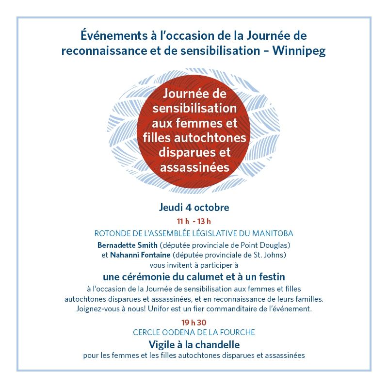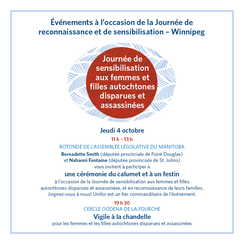 Bernadette Smith (députée provinciale Point Douglas) et Nahanni Fontaine (députée provinciale St. Johns) vous invitent à assister à une cérémonie du calumet et à un festin en reconnaissance des familles des femmes et filles autochtones disparues et assassinées.