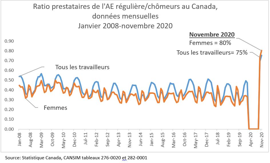 Les femmes, par exemple, sont celles qui en ont le plus bénéficié. Selon les données, 80 % des femmes au chômage ont eu accès aux prestations régulières en novembre, soit plus du double du taux d'accès mensuel moyen (36 %) depuis 2008.