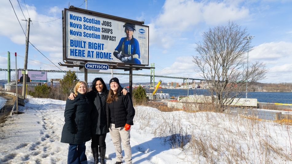 À côté de Mme Langille en tenue de soudage, le panneau indique [Traduction] « Des emplois en Nouvelle-Écosse, des navires en Nouvelle-Écosse, un impact en Nouvelle-Écosse : construits ici même, chez nous. » — une façon de souligner les emplois générés par la Stratégie nationale de construction navale du gouvernement du Canada, qui s'est engagé à construire la future flotte de la Marine royale canadienne ici même, chez nous.