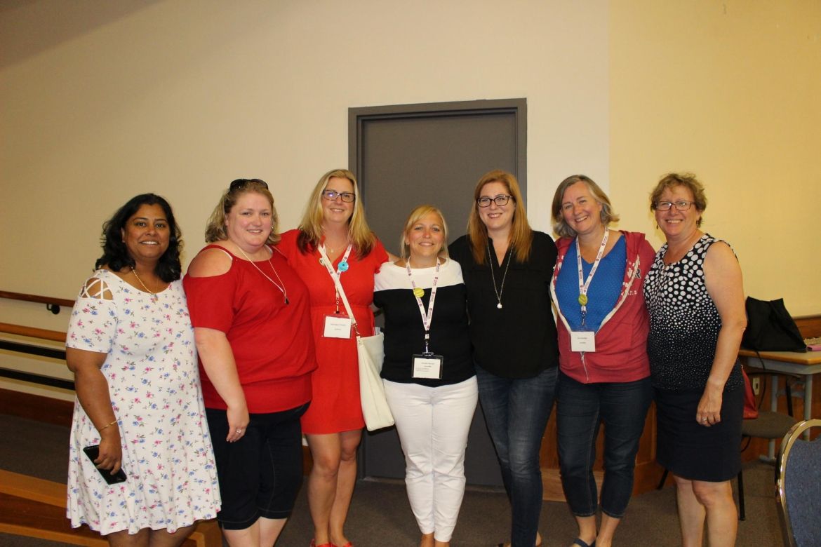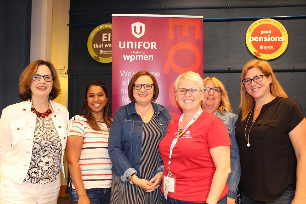 Seven Unifor sisters seated at a table during a Women's conference.