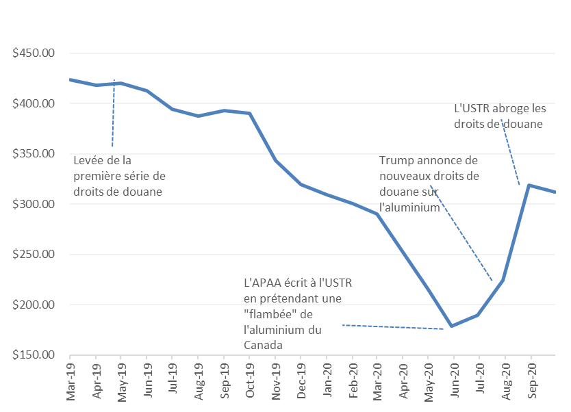 Avec la chute précipitée des prix de l'aluminium depuis octobre 2019 (voir figure 1), et avec des stocks d'aluminium cachés ou sans contrat de vente estimés à 2,5 millions de tonnes aux États-Unis, relancer la lutte tarifaire entre les États-Unis et le Canada présentait une stratégie évidente pour encourager les prix régionaux à remonter.