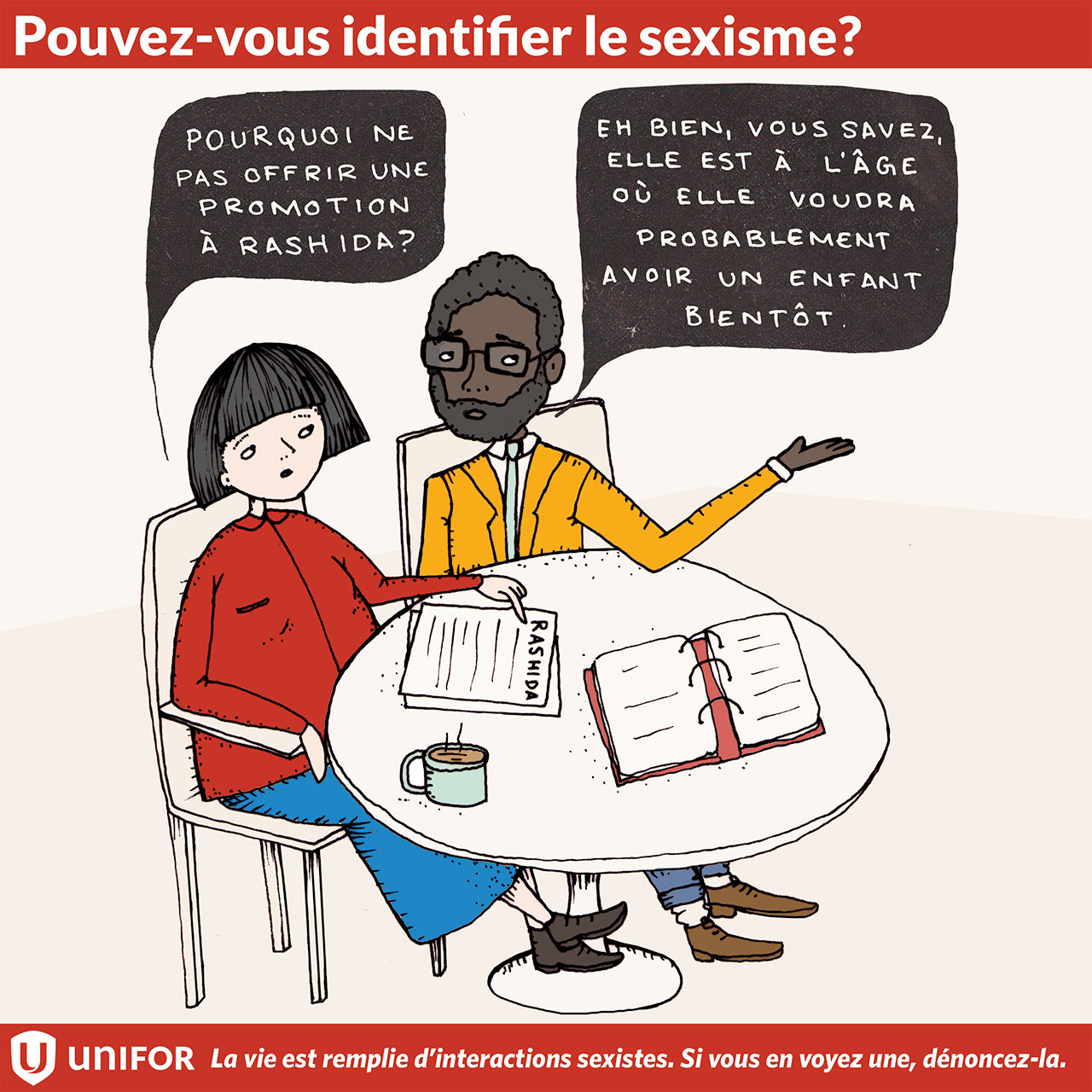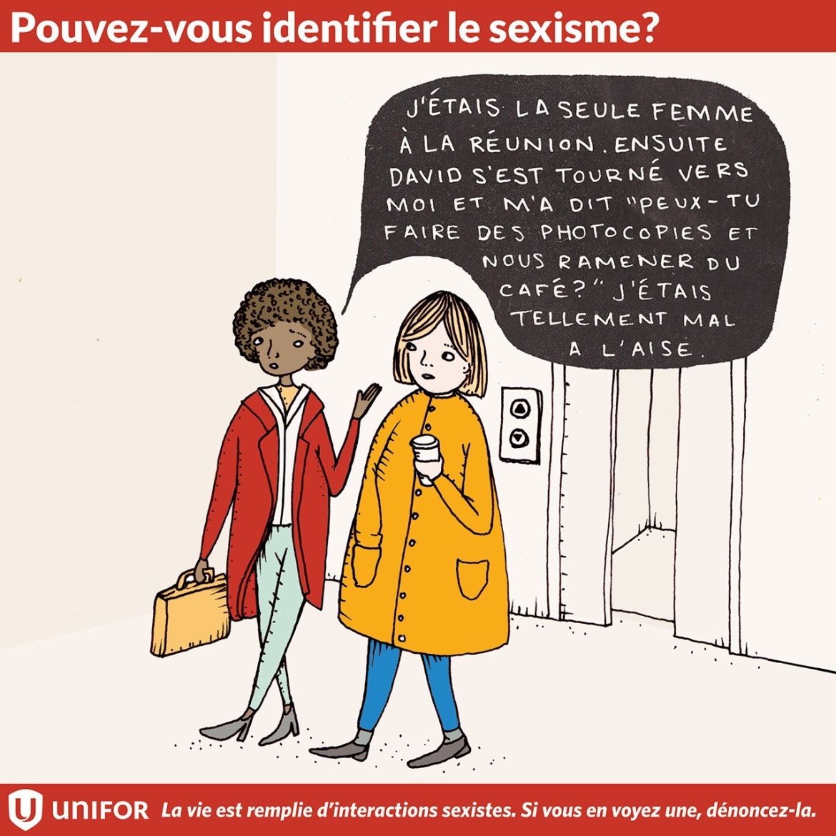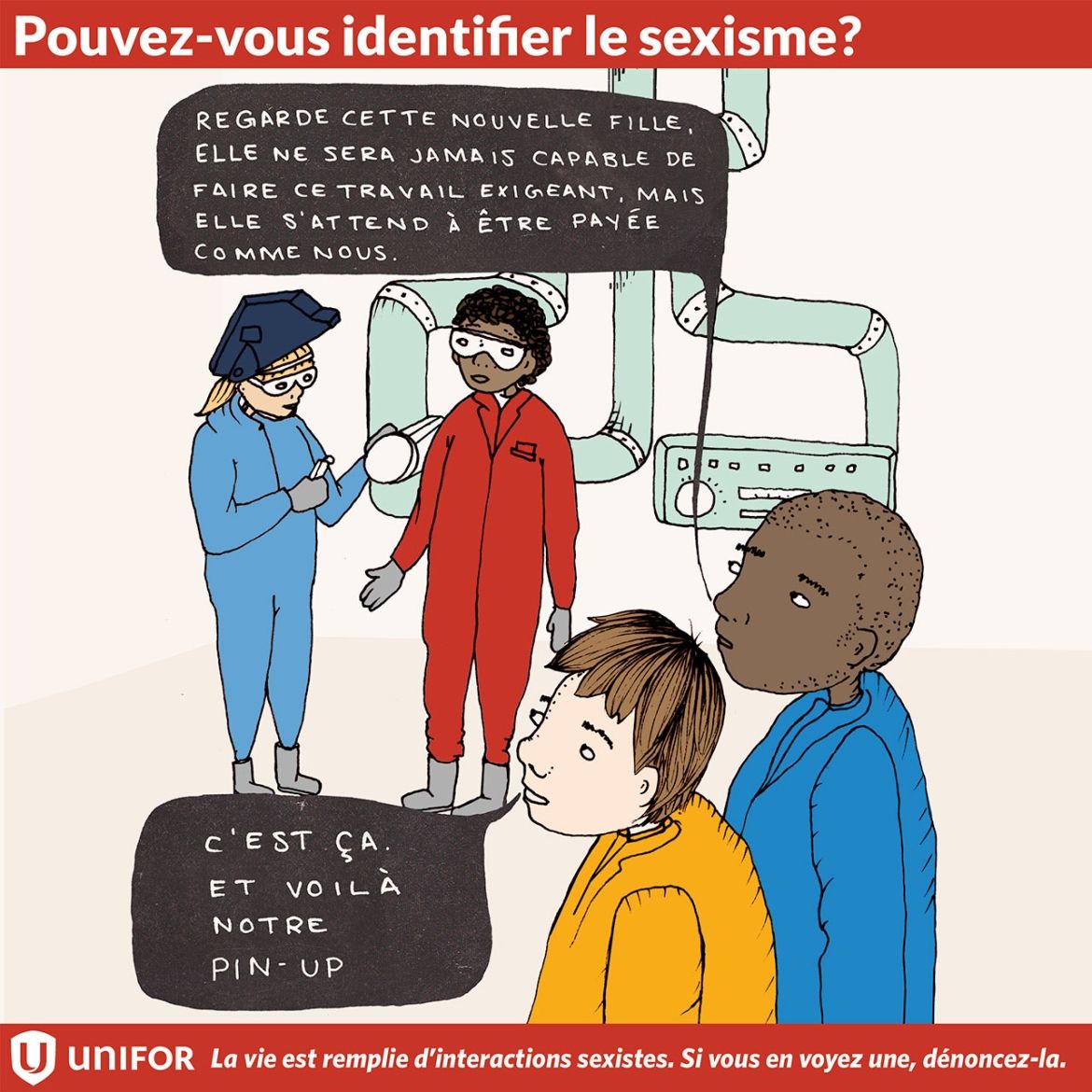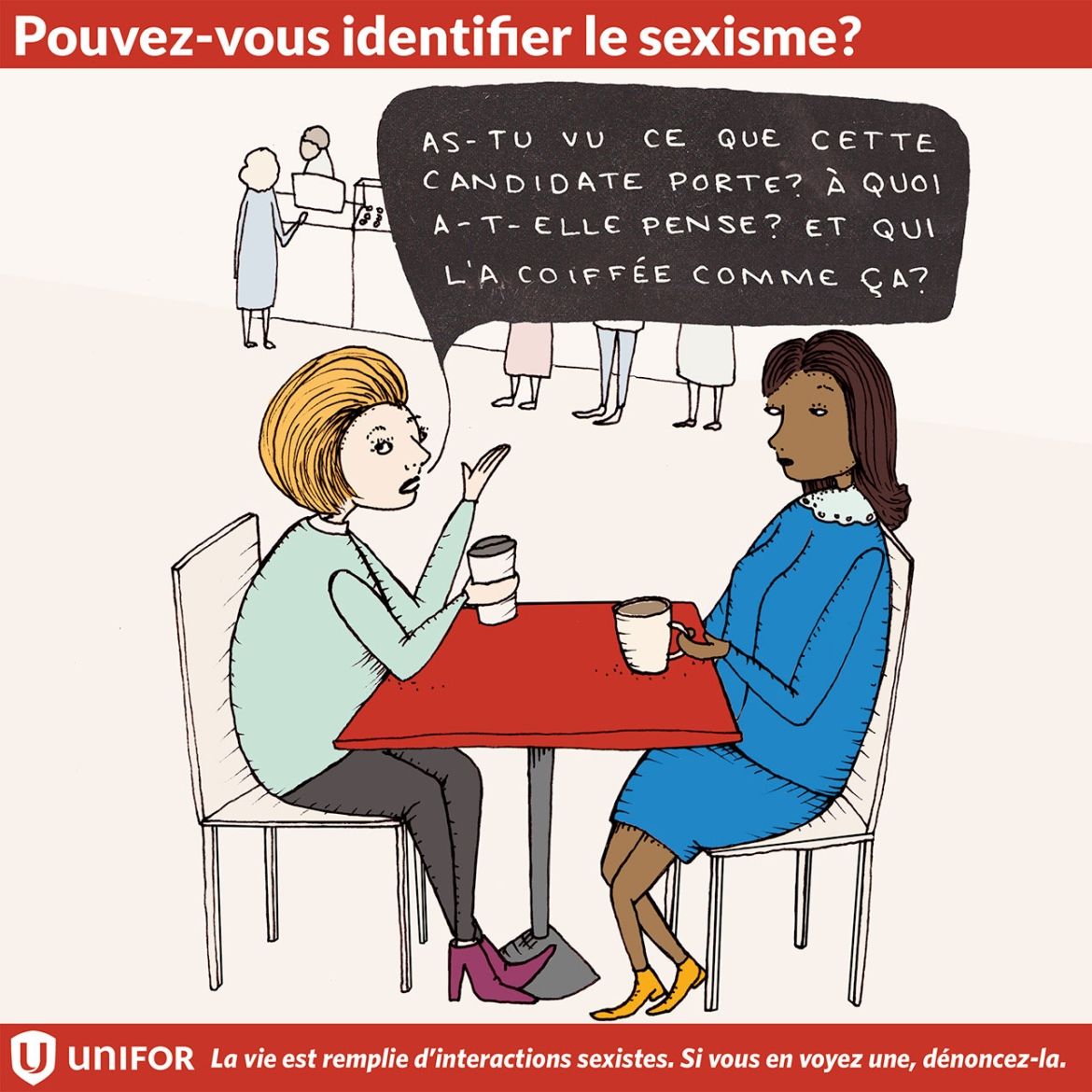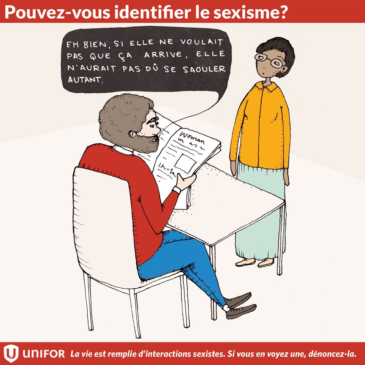 Au cours des trois prochaines semaines, Unifor lancera une série d’instantanés illustrés invitant les gens à identifier une situation sexiste. Mais, ce jeu ne se termine pas là. Une fois que le sexisme est identifié, il revient à chacun d'entre nous d'y mettre fin dans la vraie vie.