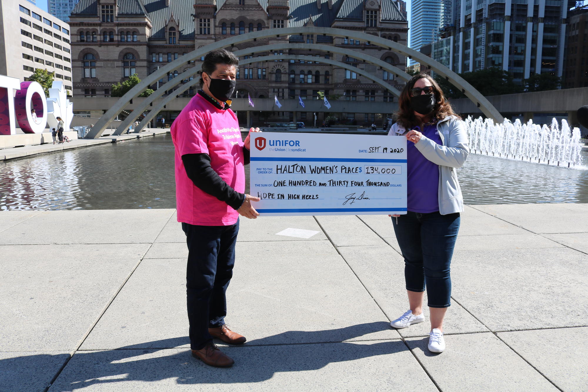 Unifor a recueilli un montant record de 137 000 dollars pour le refuge Halton Women's Place lors de la marche « Espoir en talons hauts » (Hope in High Heels) à laquelle le président national d'Unifor, Jerry Dias, et son fils Jordan, ont participé aujourd’hui.