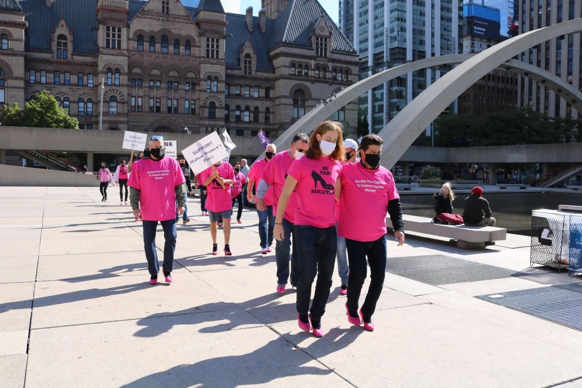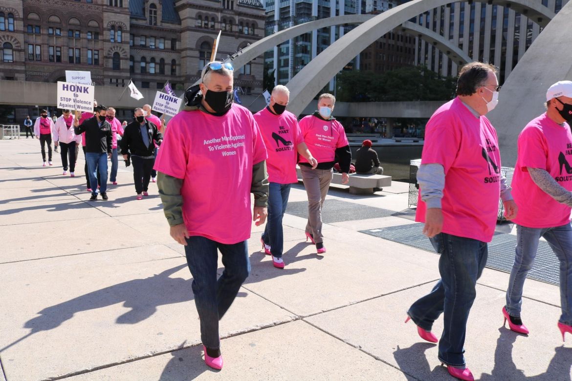 Cette année, les marches annuelles « Espoir en talons hauts » ont été modifiées en raison de la COVID-19. Unifor a choisi d'organiser une marche avec un nombre limité d'hommes en respectant la distanciation sociale au square Nathan Phillips, au cœur du centre-ville de Toronto.