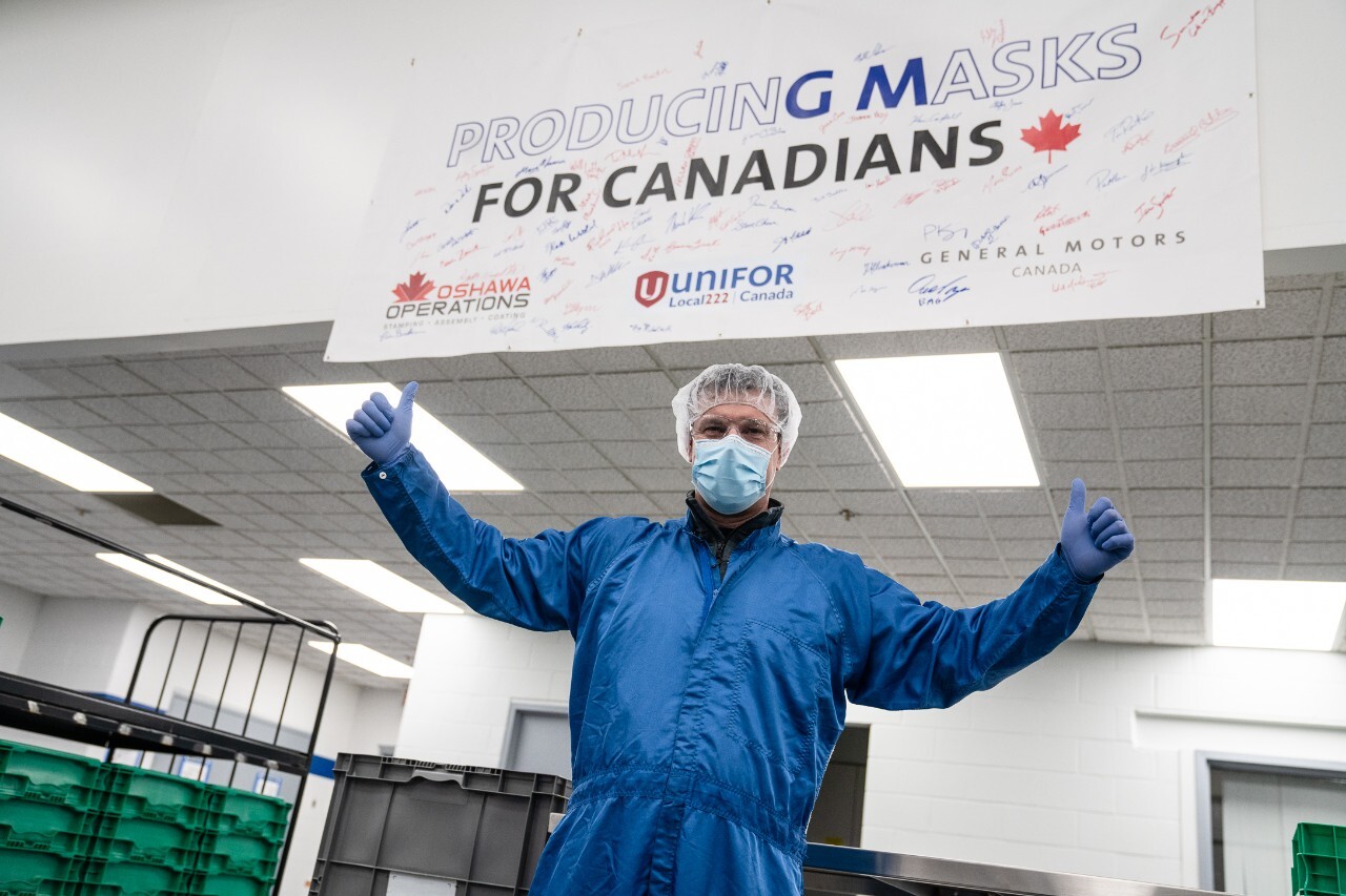 Les membres d'Unifor travaillant à l'usine de General Motors à Oshawa ont commencé à fabriquer 10 millions de masques après avoir obtenu un contrat avec l'Agence de santé publique du Canada, annoncé le 26 mai dernier.