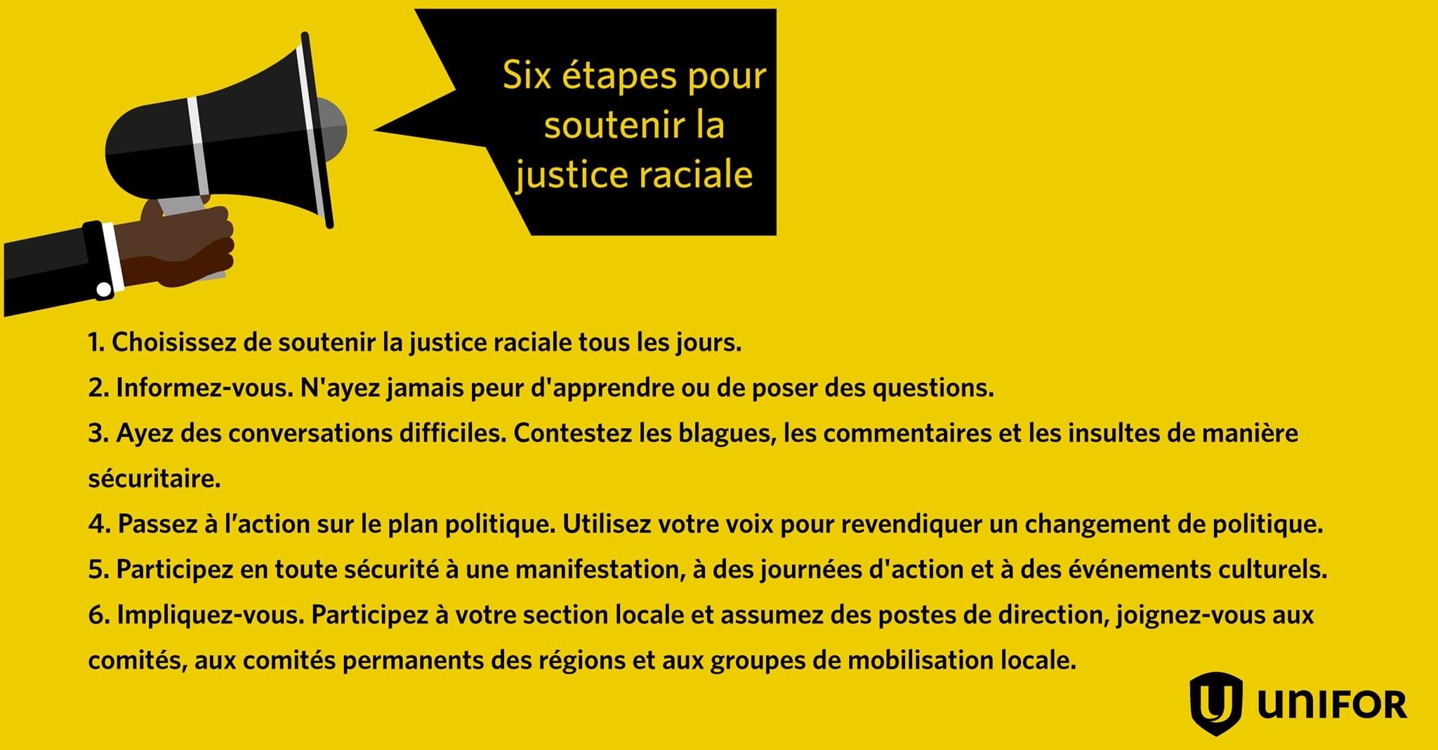 Le mouvement syndical a été créé par des travailleuses et travailleurs déterminés à instaurer l'équité et la justice dans les lieux de travail et les collectivités. Nous avons réalisé nos plus grands progrès lorsque nous avons compris l'importance de lutter contre la discrimination, et la nécessité d'unir tous les travailleurs et travailleuses, quelle que soit leur race. Unifor perpétue cette tradition et s'engage à utiliser son pouvoir de négociation, le pouvoir du peuple et le pouvoir politique pour instaurer la justice raciale.
