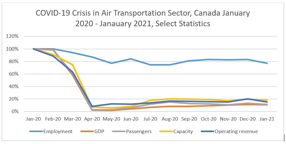 The chart below illustrates the COVID-related economic consequences on Canada’s air transportation sector. Essentially, the industry output fell off a cliff.