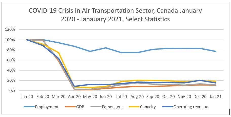 Large Canadian airlines carried less than 800,000 people in January. That’s nearly 90% less than the number of passengers the same airlines carried in January 2020.Operating revenues are down 85% compared to January 2020. GDP created by the industry fell even further, to just 11% of pre-COVID levels.