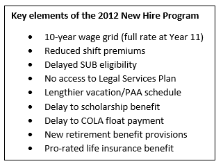 Negotiated in 2012, the New Hire Program (often referred to as the “Grow-in”) established a lengthier timeframe for newly hired hourly workers to attain the equivalent rate of pay and other benefits as traditional members.