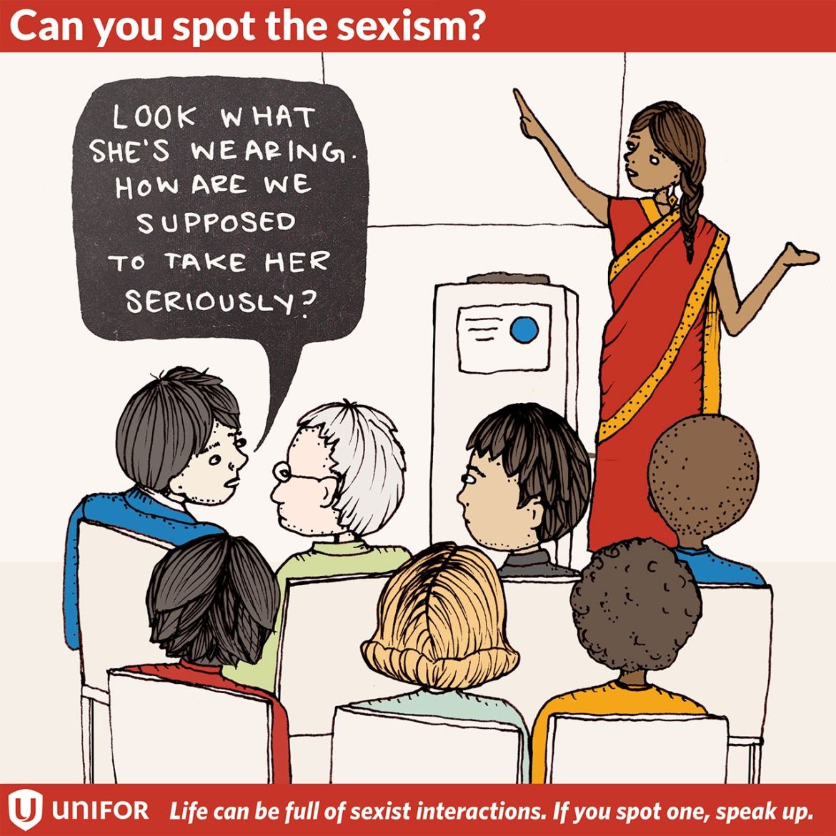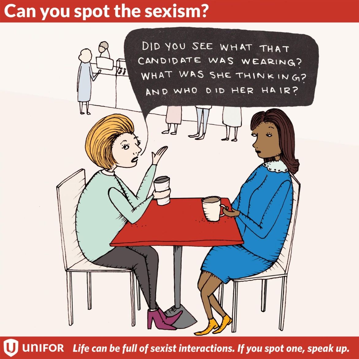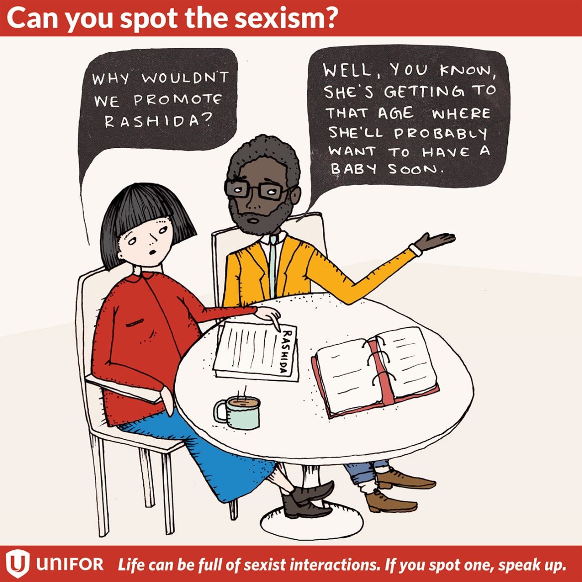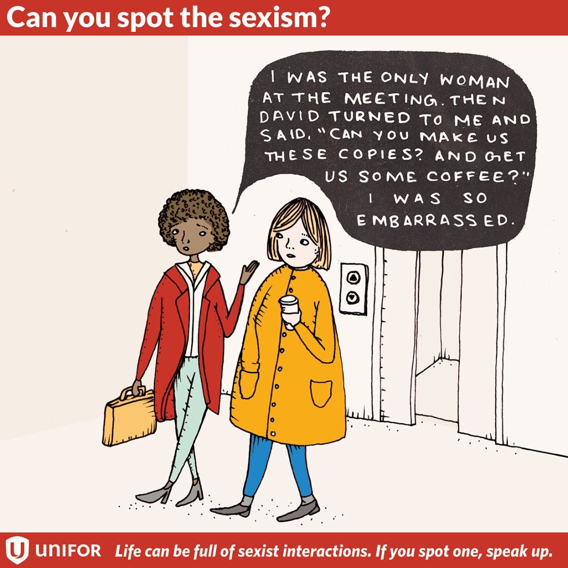 Over the next three weeks, Unifor is launching a series of illustrated snapshots where people are asked to spot the sexism. But it’s only partly a game – once you spot it, it’s up to each of us to put a stop to it in real life.