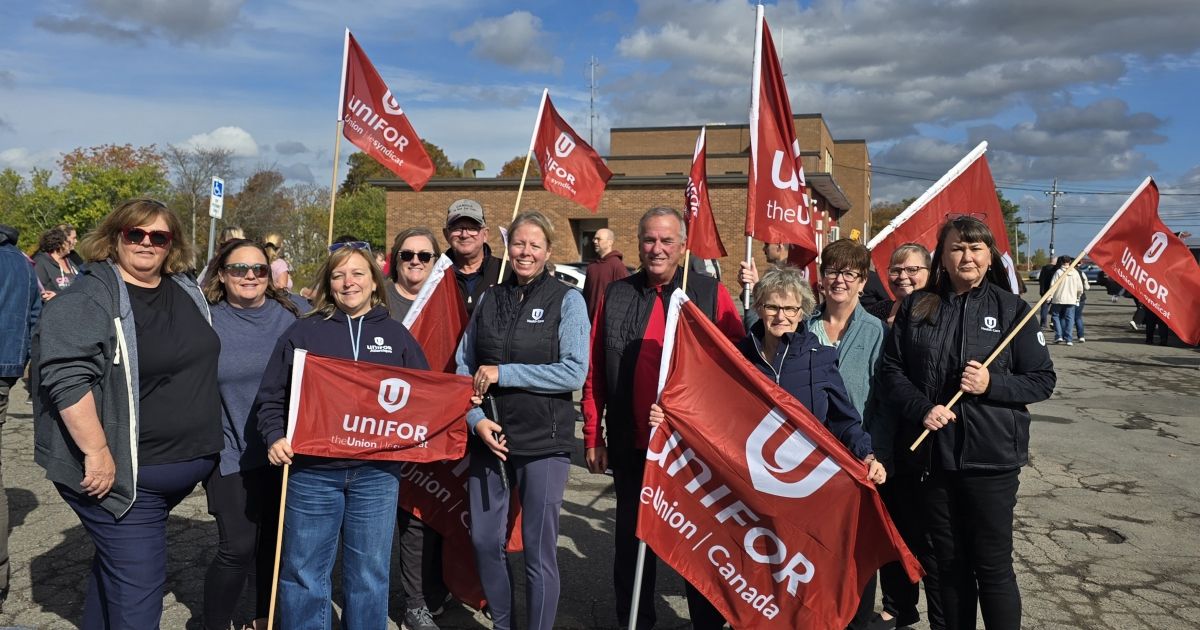 Unifor long-term care members stood side-by-side with union members from across Nova Scotia outside Premier Tim Houston’s constituency office Westville, N.S., to demand his government begin negotiations, two years after their collective agreement expired.
