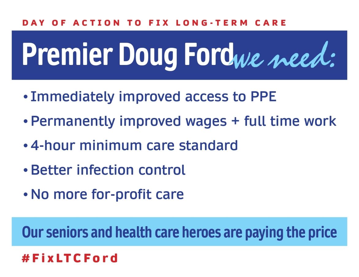 The online action had individuals contribute selfies while holding a poster of demands to Premier Ford. More than a thousand submissions were made on Facebook and Twitter under the hashtag #FixLTCFord.