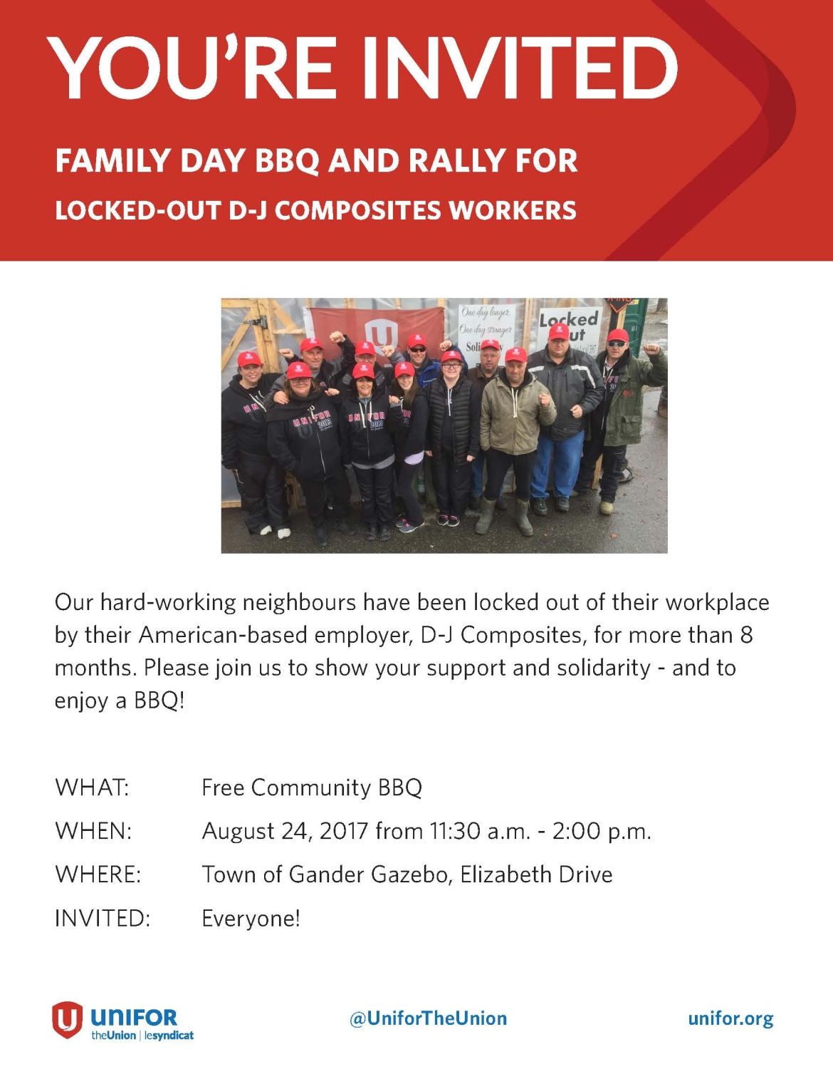 Our hard-working neighbours have been locked out of their workplace by their American-based employer, D-J Composites, for more than 8 months. Please join us to show your support and solidarity - and to enjoy a BBQ!