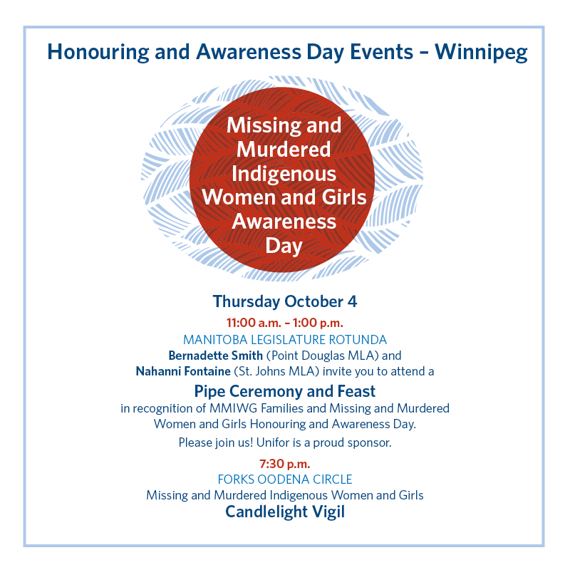 Bernadette Smith (Point Douglas MLA) and Nahanni Fontaine (St. Johns MLA) invite you to attend a pipe ceremony and feast in recognition of MMIWG families and Missing and Murdered Indigenous Women and Girls.