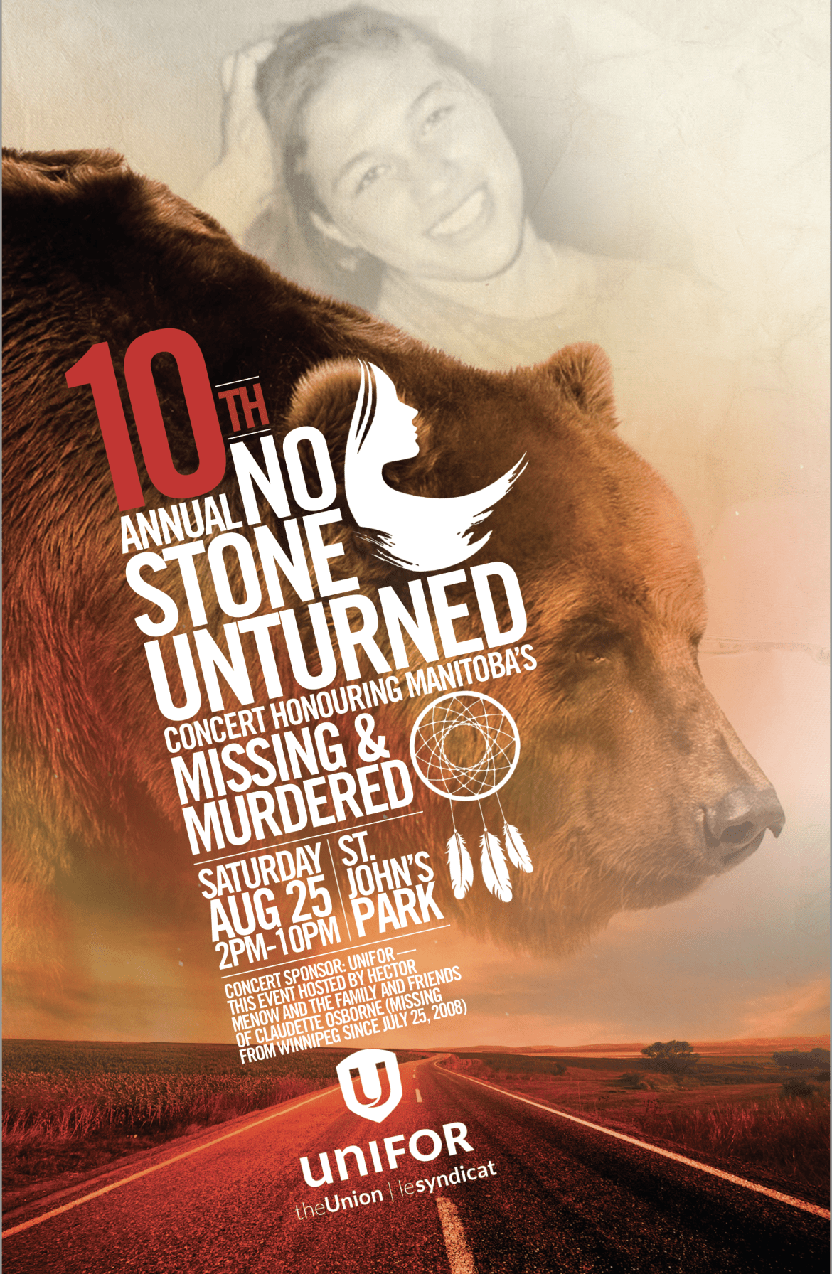 Unifor is proud to sponsor this weekend’s No Stone Unturned free concert honouring Manitoba’s missing and murdered.