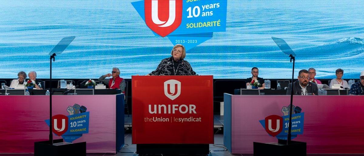 Lana Payne stands at the podium on stage with the Unifor graphic in the background.