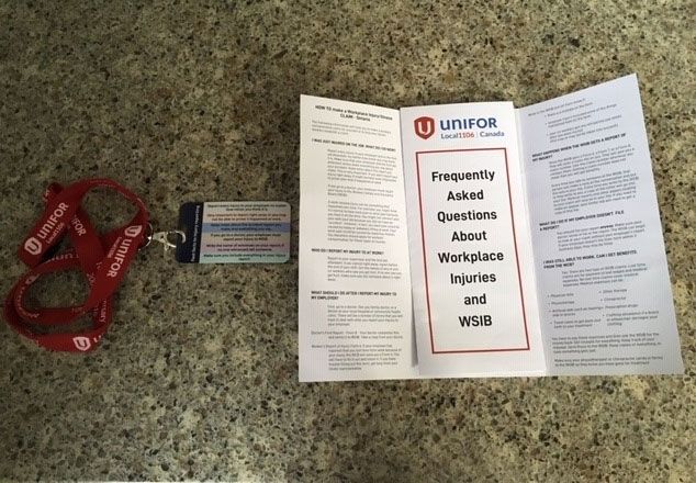 It was during these discussions that we came up with the idea of developing “Fast facts to injury reporting” and a pamphlet on, “Frequently asked questions about workplace injuries and WSIB.” Ruth Pryce, our local president, asked me to work in conjunction with Vinay Sharma, Unifor National Rep for Health and Safety, to develop a lanyard card to put onto our name badges as well as a pamphlet to hand out to our members when we present this card.